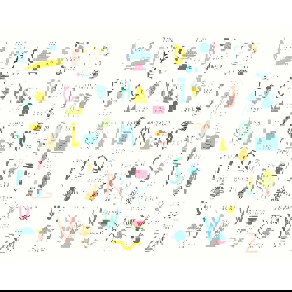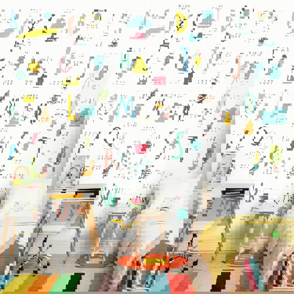 This Scandinavian style design is an aesthetic yet educational mural, depicting all the letters of the English alphabet alongside charming illustrations that correspond each letter. Against a simple ground this design is minimalistic whilst still engaging.