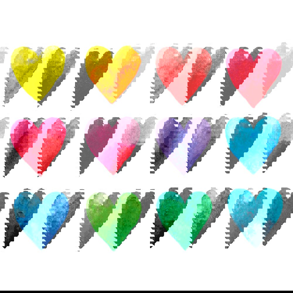 Simple yet sweet, softly water-coloured hearts in a range of vibrant hues adorn the full width and height of this mural, against a plain ground this design is effortless and clean.