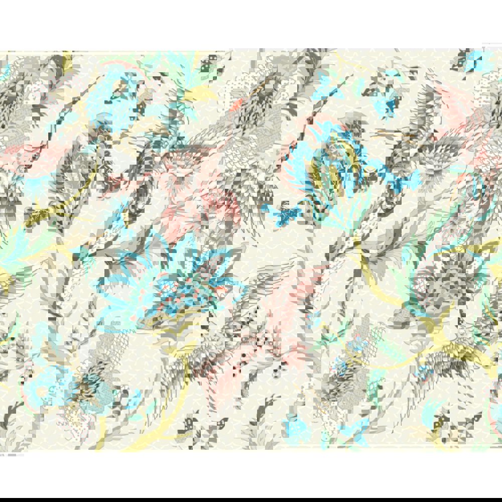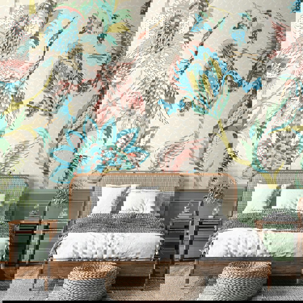 Oversized cranes take flight surrounded by large blooming flowers and stems in this opulent design. With their feathers fanned majestically, this design has an almost regal feel to it and is bound to introduce a sense of luxury to your space.