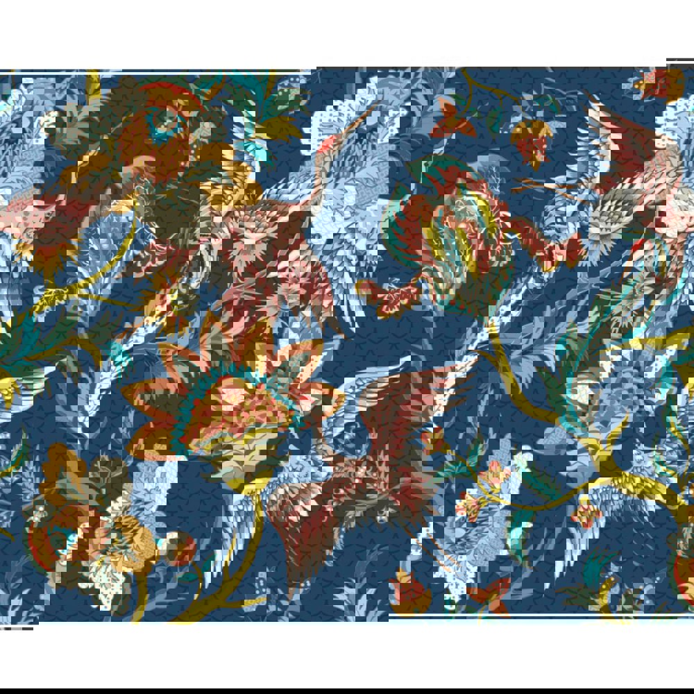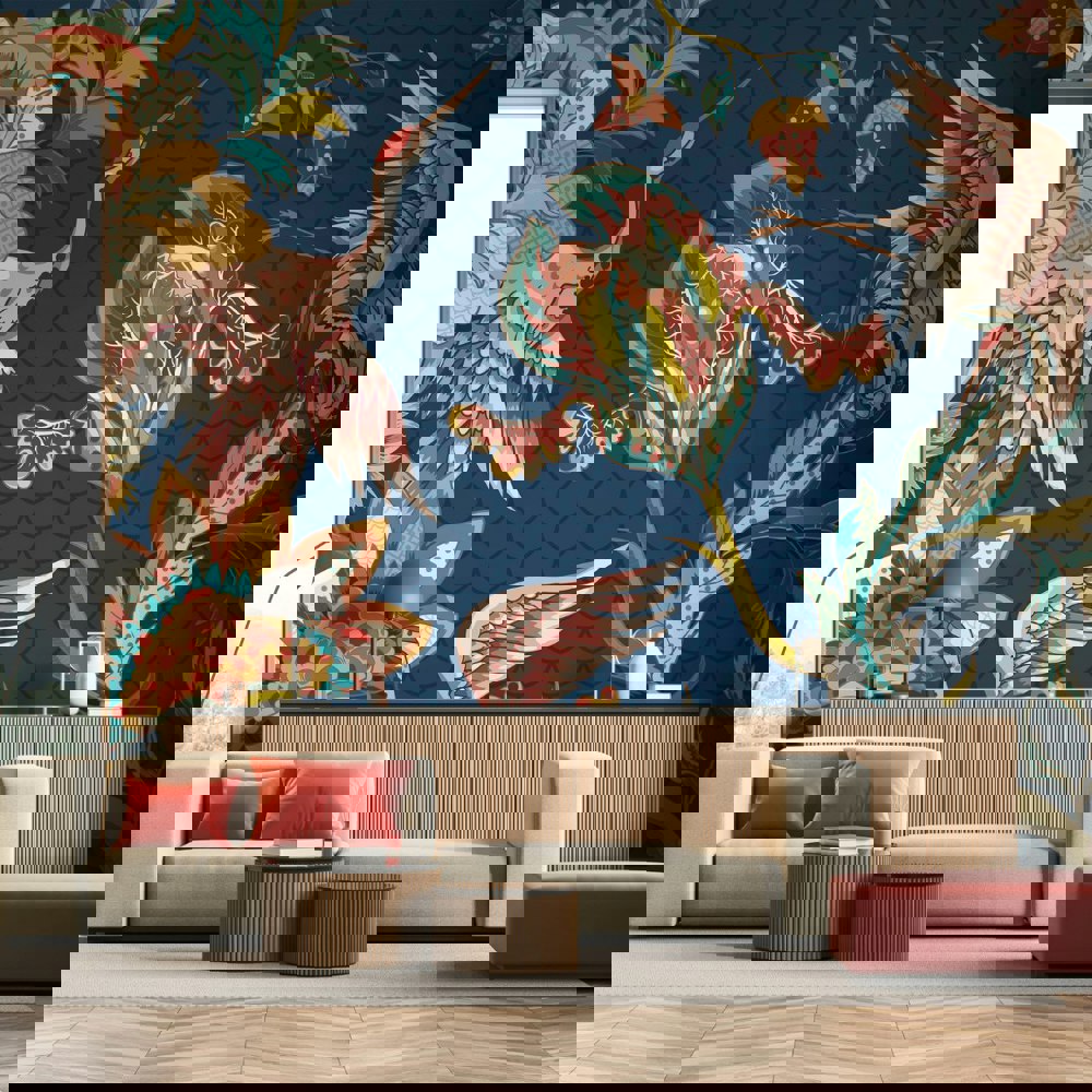 Oversized cranes take flight surrounded by large blooming flowers and stems in this opulent design. With their feathers fanned majestically, this design has an almost regal feel to it and is bound to introduce a sense of luxury to your space.