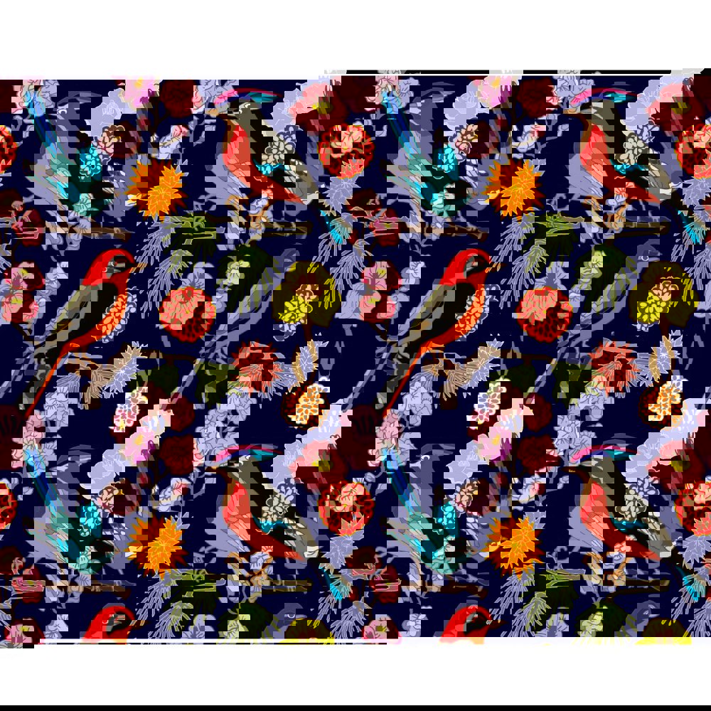 Graphic and illustrative birds perch on slender branches decorated with various vibrant blooms. Emulating warmer months, this line-drawing design is a stunning hub of colour and life.