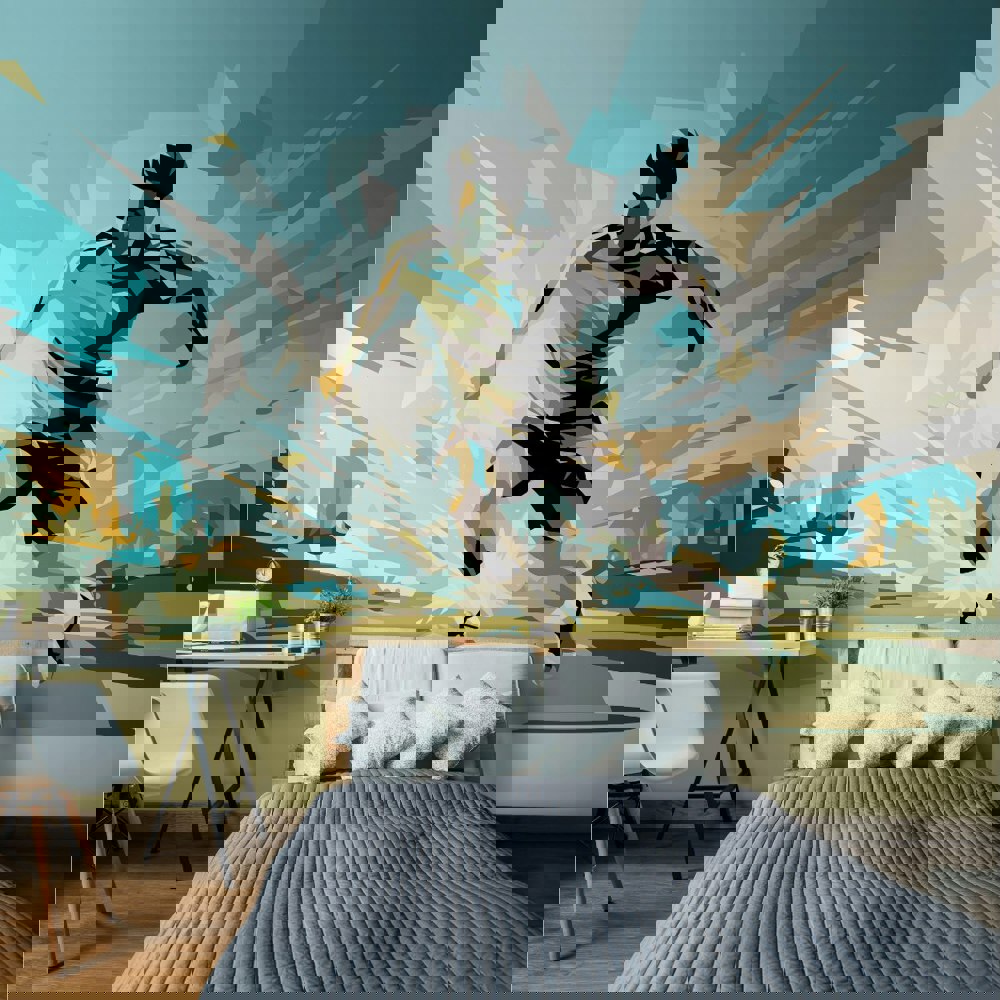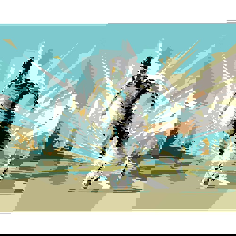 This mural displays the silhouette of a football player dribbling the ball against a graphic yet abstract background, creating a sense of movement and dynamicity.