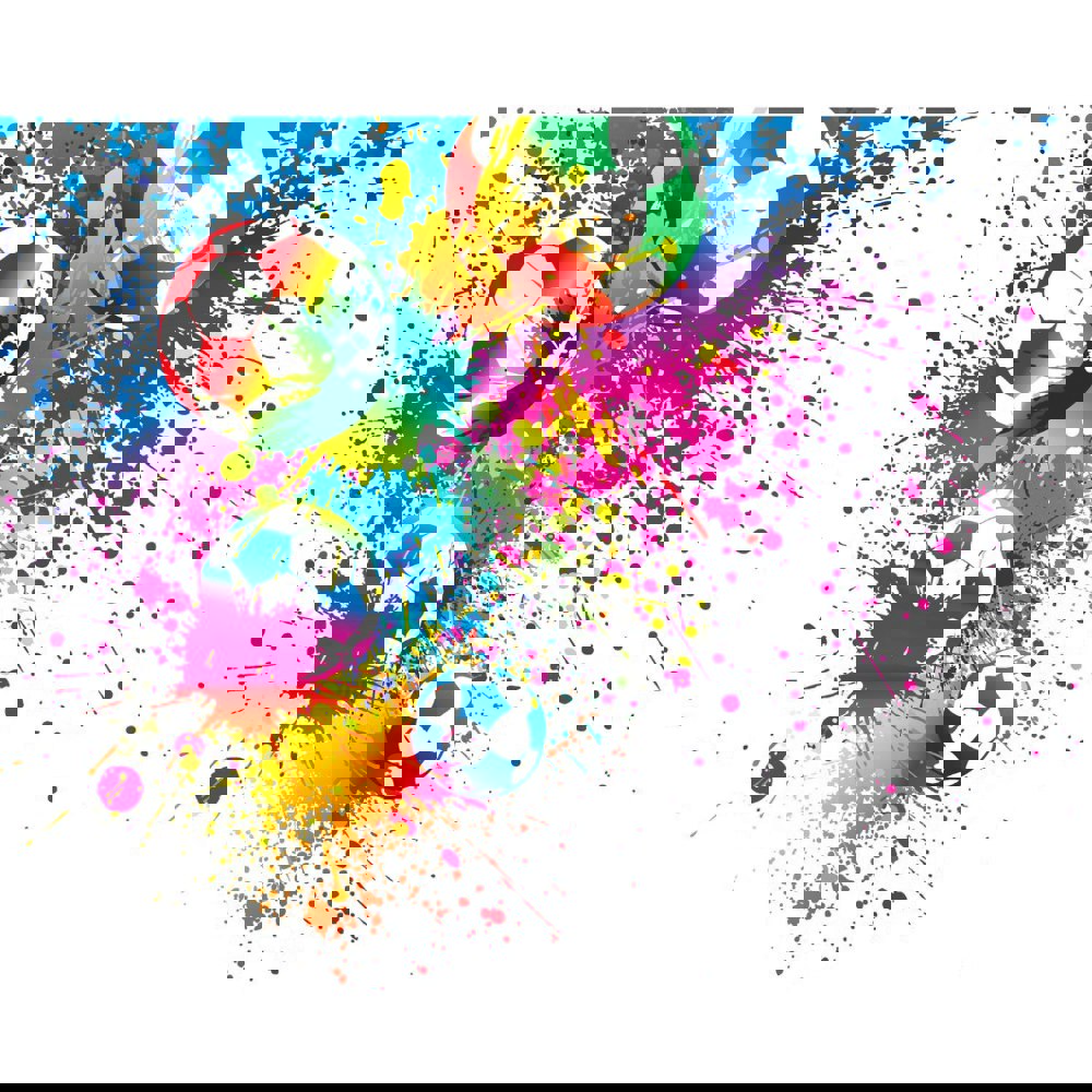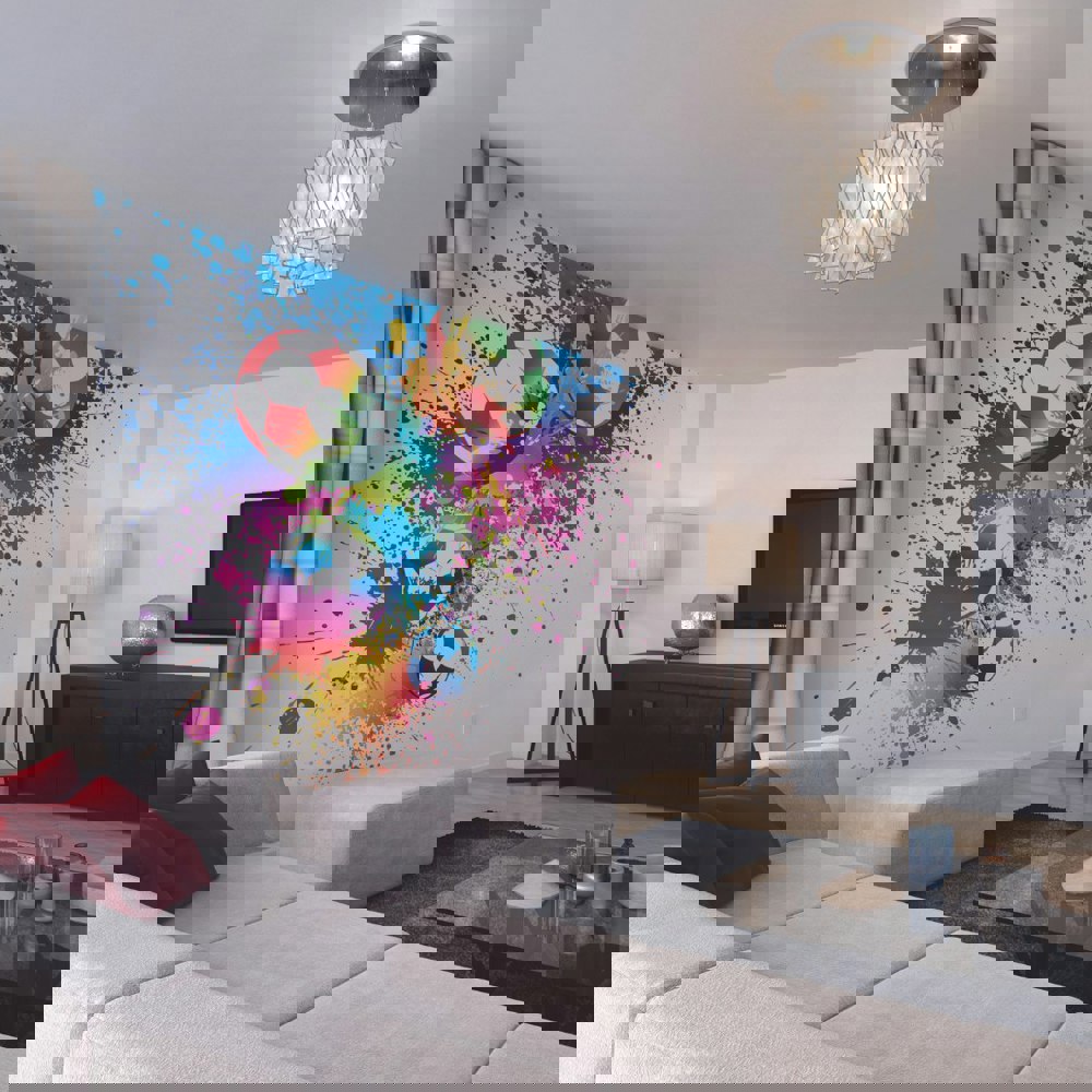 Make a statement with this bold and vibrant design, bursting with colour and dynamicity. This loud and playful mural takes football to a whole new level.