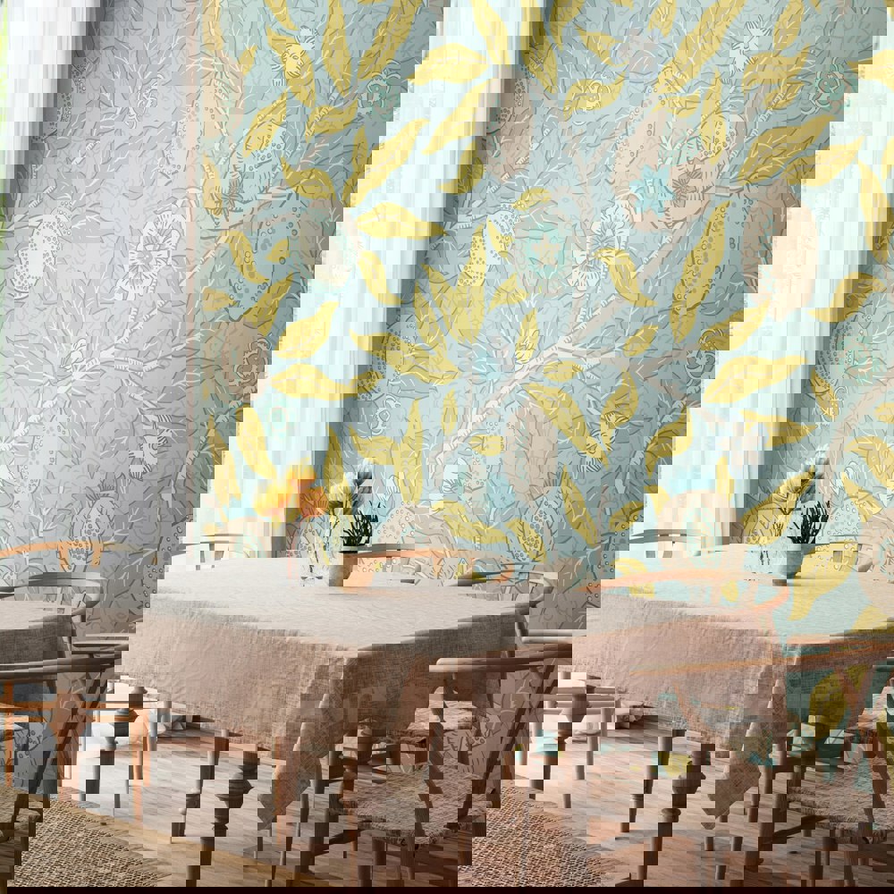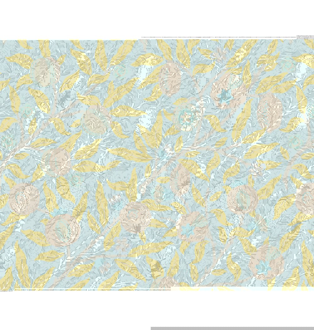 This design features an abundance of fine diagonal branches sprouting stylised flowers and pomegranates nestled amongst overflowing flora and fauna. The design has a simple honesty and creates an open, modern design
