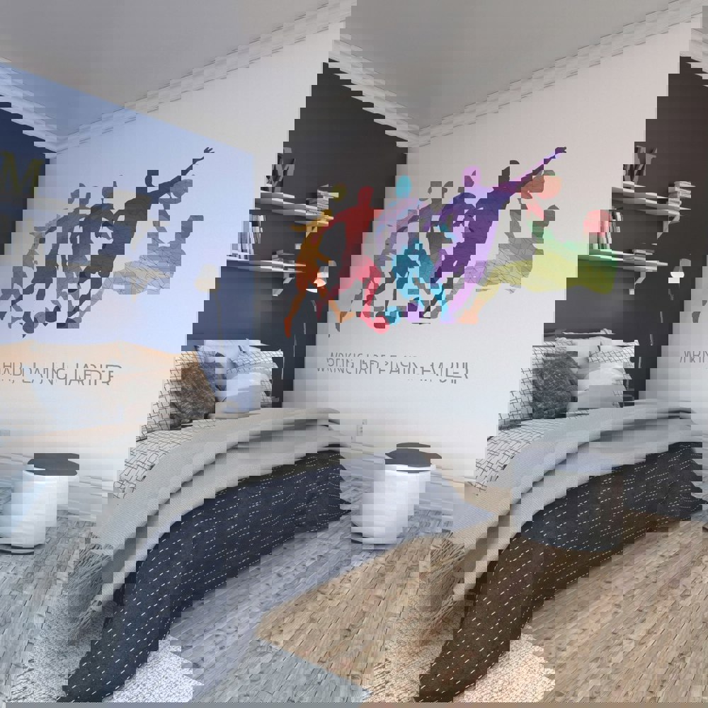 This design features colourful geometric silhouettes against a plain backdrop, creating contrast and making it a statement choice, whilst an inspirational quote adds further dimension and character.