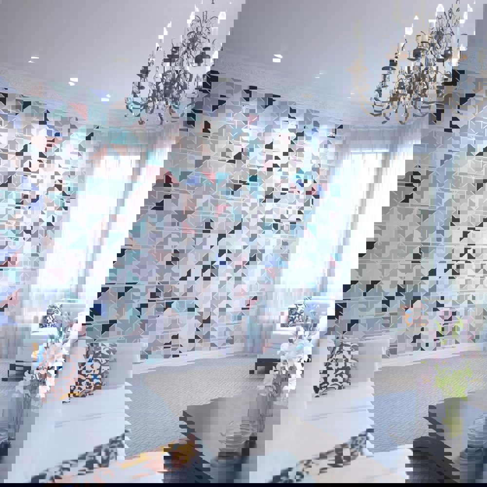 Asymmetric triangles come together and create a kaleidoscopic effect, in this crisp geometric design, an eye-catching yet smart choice.
