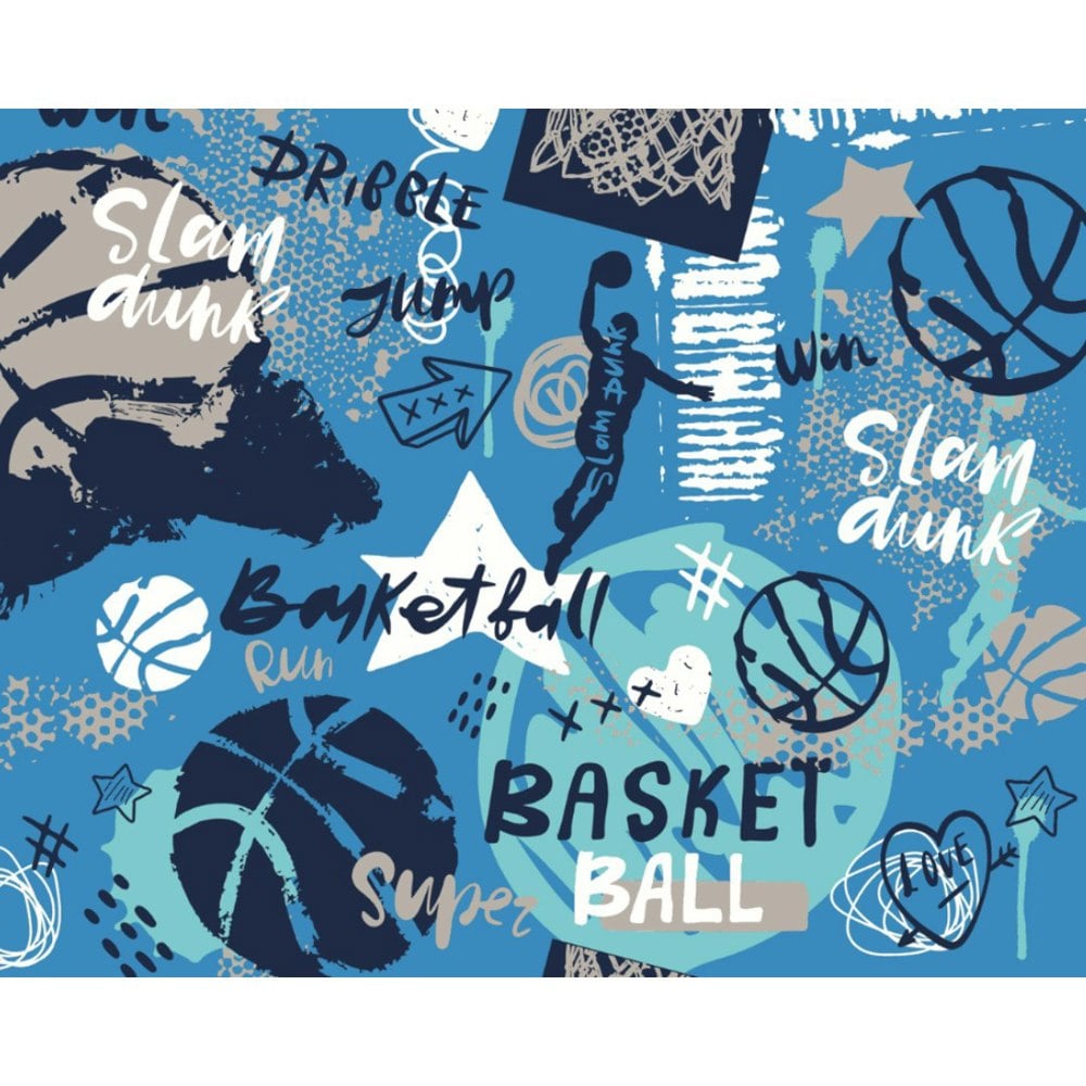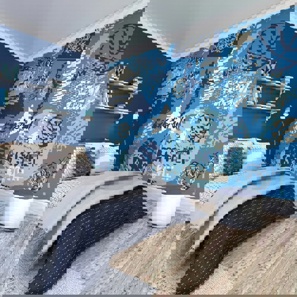 Urban and full of character, this design features graffiti style basketball-themed illustrations and writing. The layering of the doodles creates a sense of dimension and dynaicity, an inspiring mural for any basketball fan.