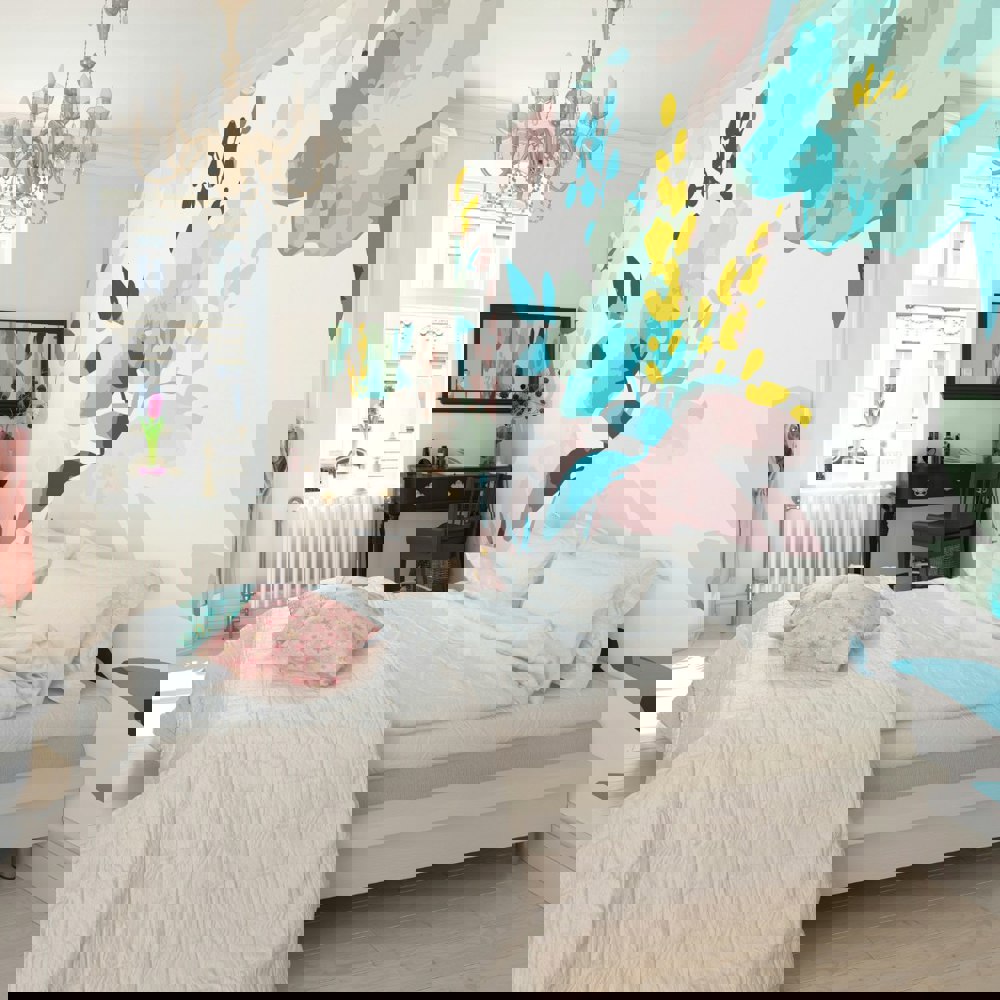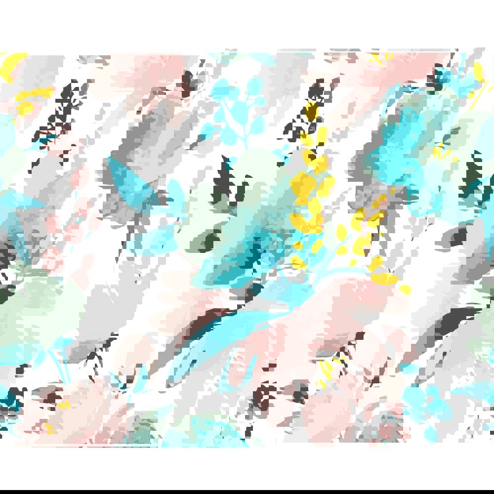Graphic leaves and joyful florals in block pastel colour provide a refreshing contrast against a plain ground, with spots of watercolour shading bringing the design to life.