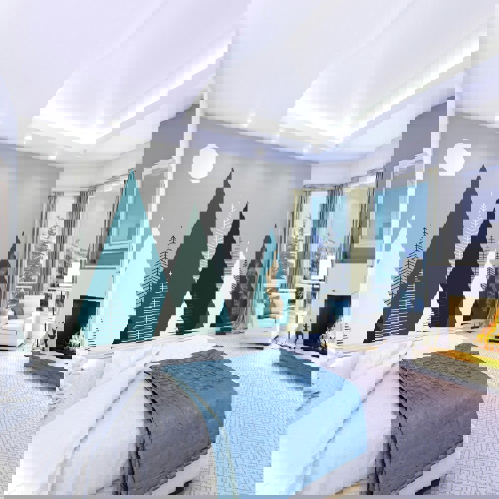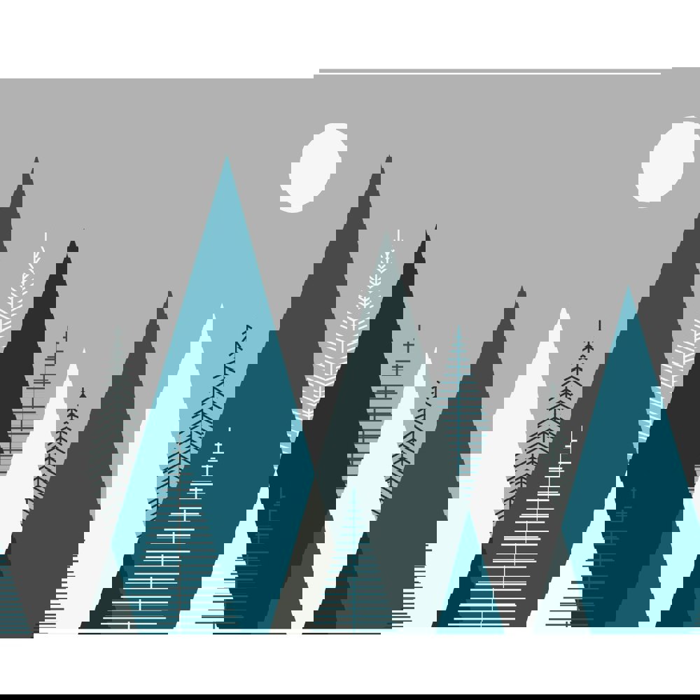 Clean and contemporary, sharp geometric lines combine to form the shapes of mountains and fir trees in this Scandinavian-inspired graphic Mountainscape. Minimalistic yet bold at the same time.