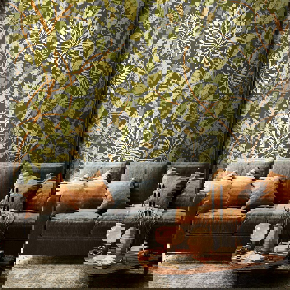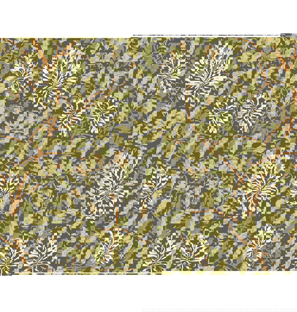 Realistic honeysuckle vines intertwine with leaves and weave across the wall. Inspired by the detailed illustration by May Morris this design pays homage to the arts and craft design era.
