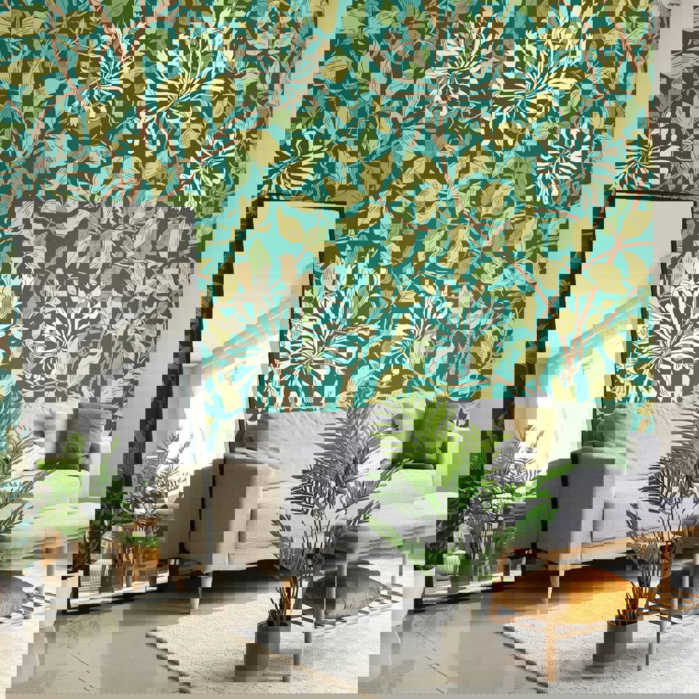 Realistic honeysuckle vines intertwine with leaves and weave across the wall. Inspired by the detailed illustration by May Morris this design pays homage to the arts and craft design era.