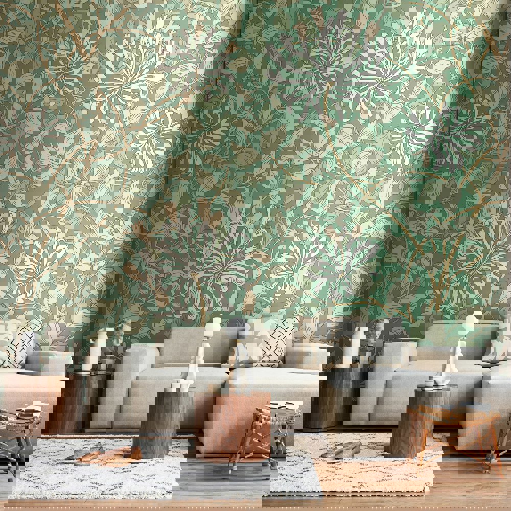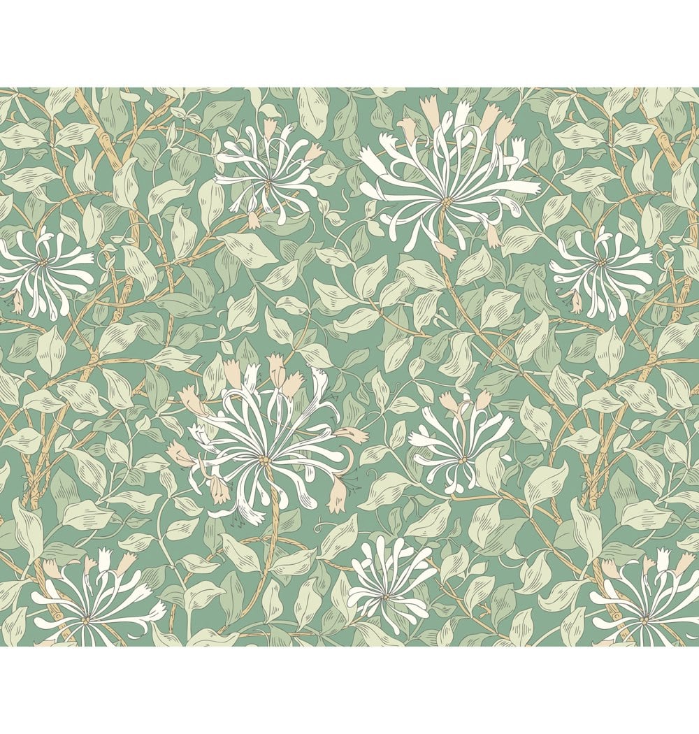 Realistic honeysuckle vines intertwine with leaves and weave across the wall. Inspired by the detailed illustration by May Morris this design pays homage to the arts and craft design era.