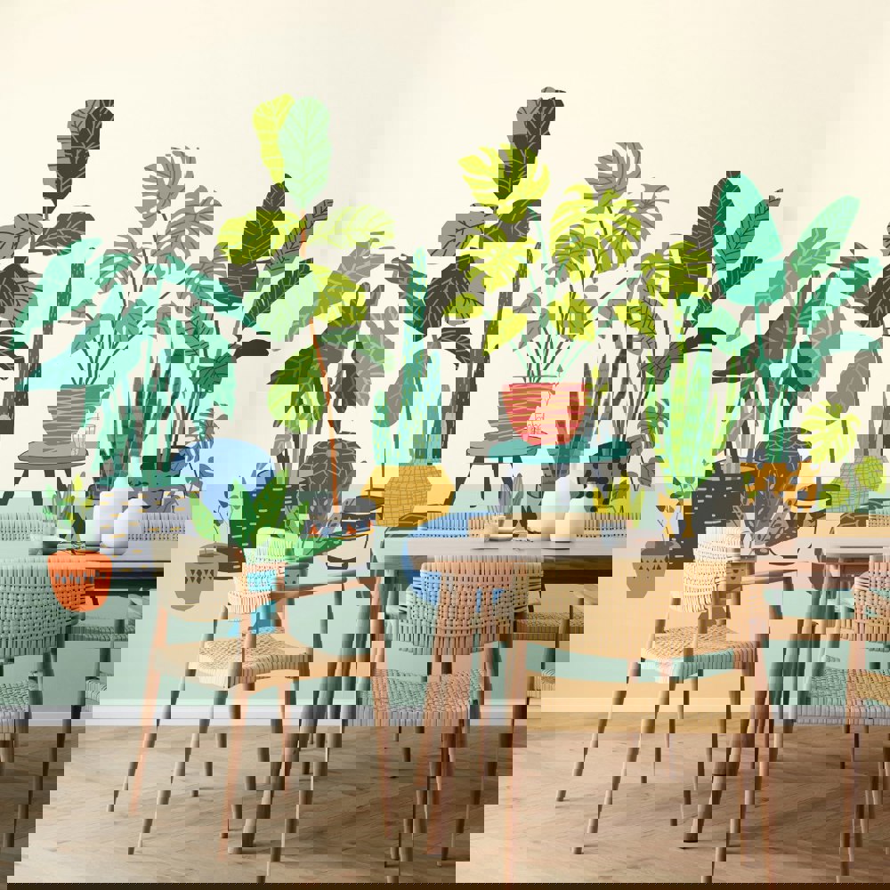 This charming mural depicts houseplants of all shapes and sizes in decorative ceramic pots and perched on small tables. Large leaves on tall stems reach skyward, whilst smaller cacti and more dainty greenery sit at the foreground of the scene alongside pouf cushions.