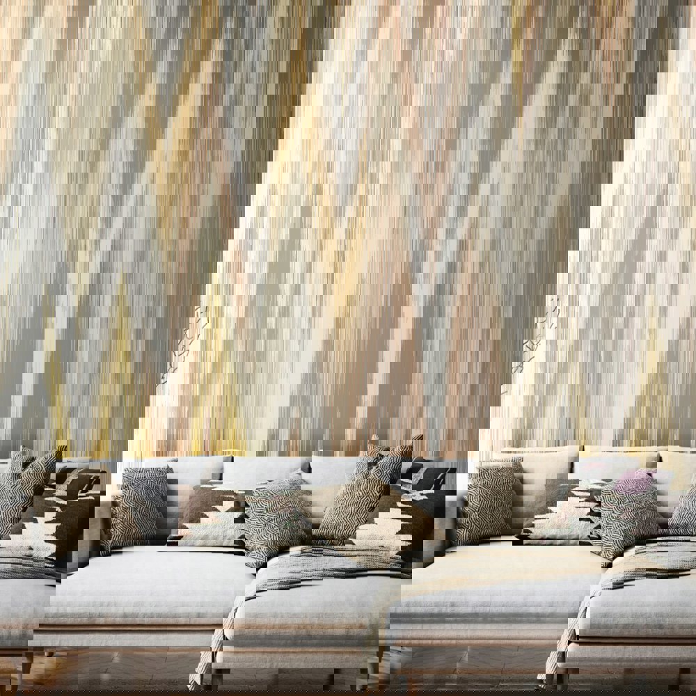 A dramatic statement design of blended lines creates a large scale Ikat zig zag. The blurred multi coloured lines create a softer take on a geometric design by mimicking a woven texture.
