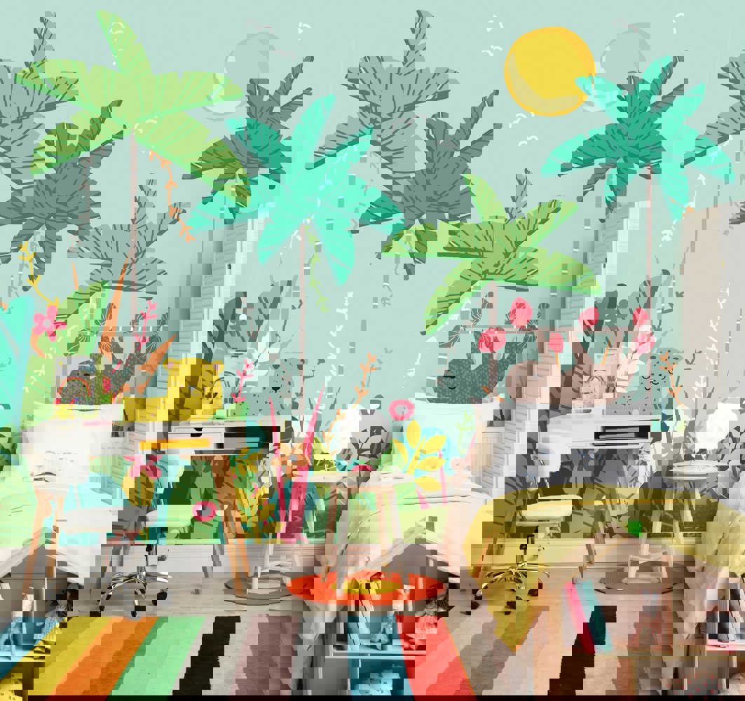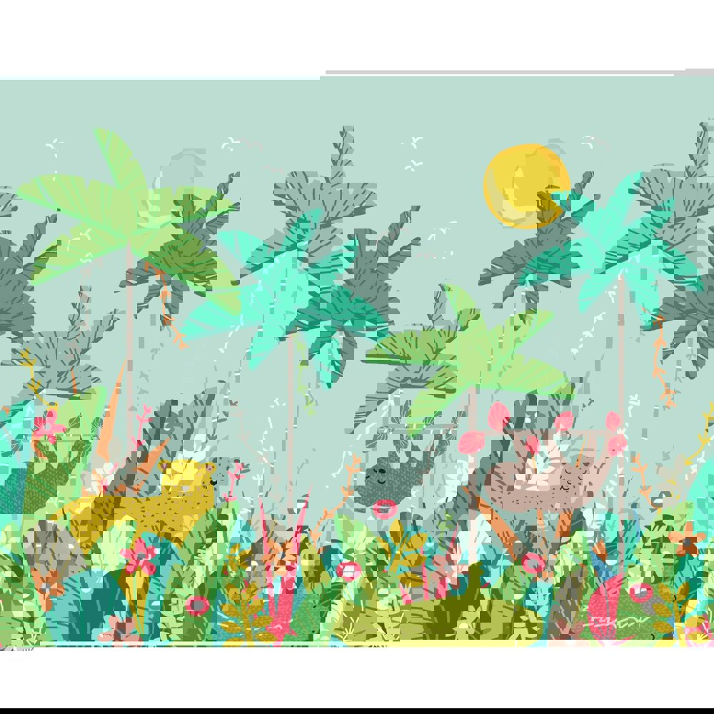 This children’s wall mural depicts a leopard, crocodile and sloth nestled together in a cheerful jungle scene. Graphic flowers, vines and trees intertwine around them to keep them shaded from the sun.
