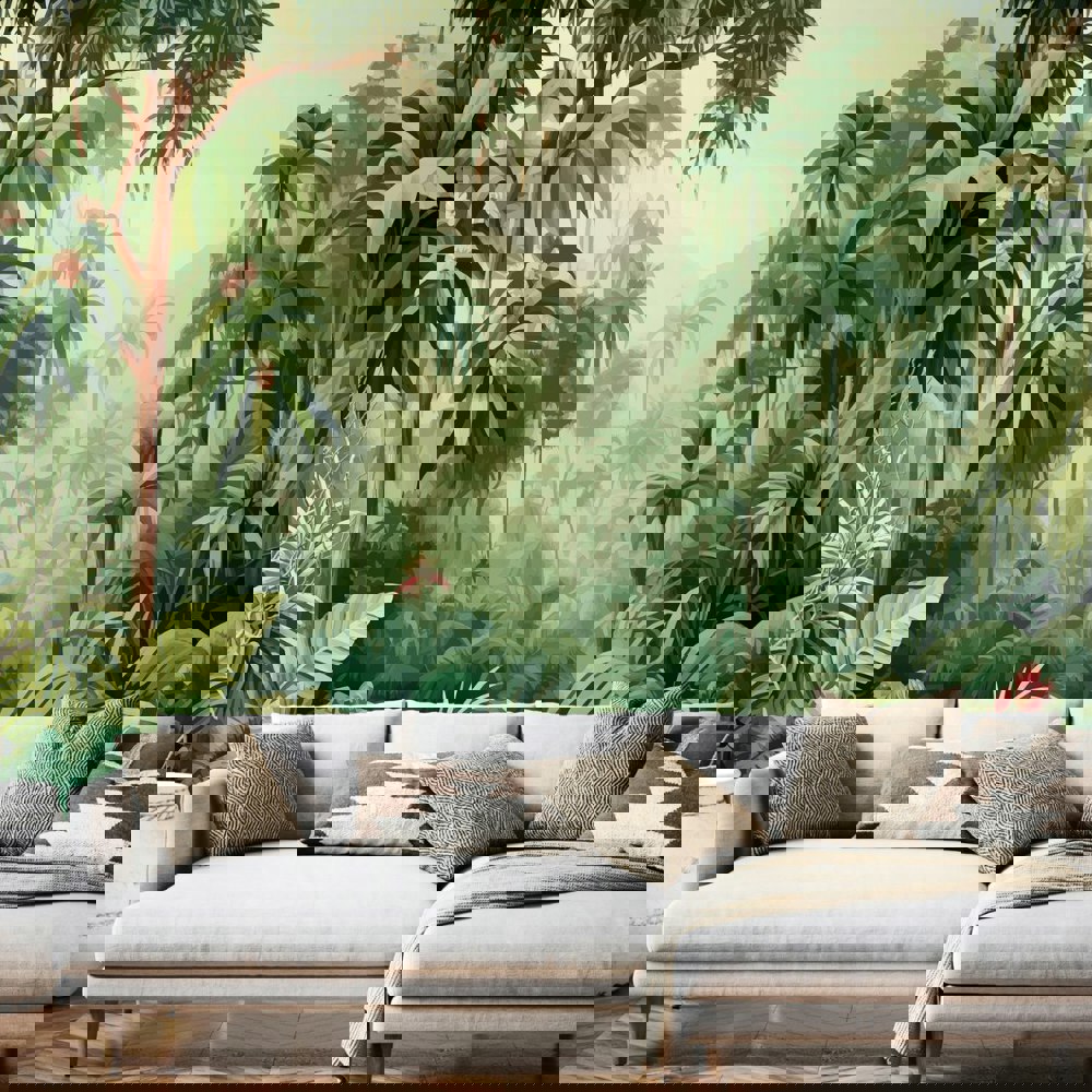 Depicting a jungle scene of dense foliage and palm trees, with more faded, distant palm trees and mountains featured in the background, truly allowing a sense of depth and dimension.
