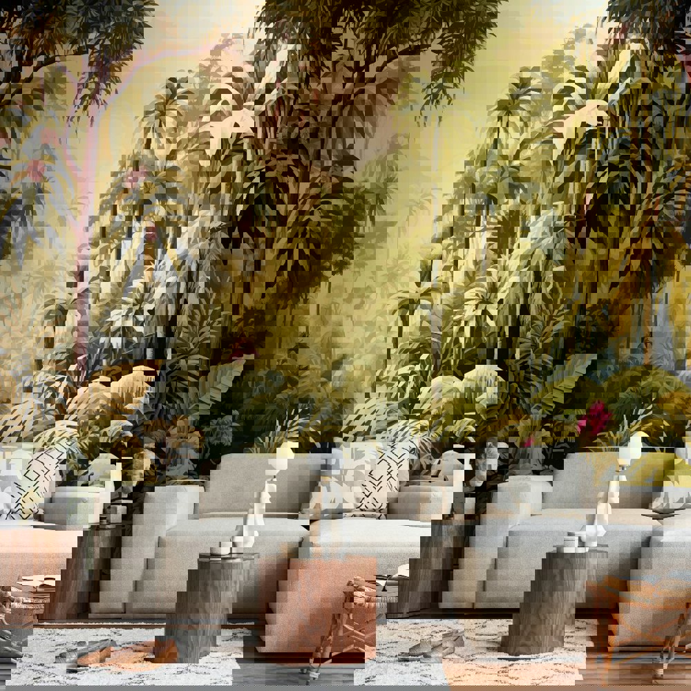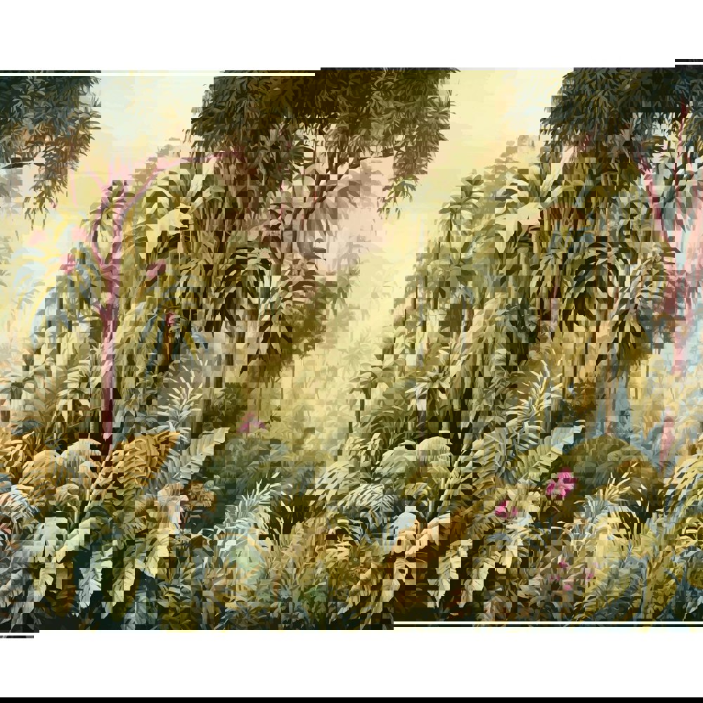 Depicting a jungle scene of dense foliage and palm trees, with more faded, distant palm trees and mountains featured in the background, truly allowing a sense of depth and dimension.