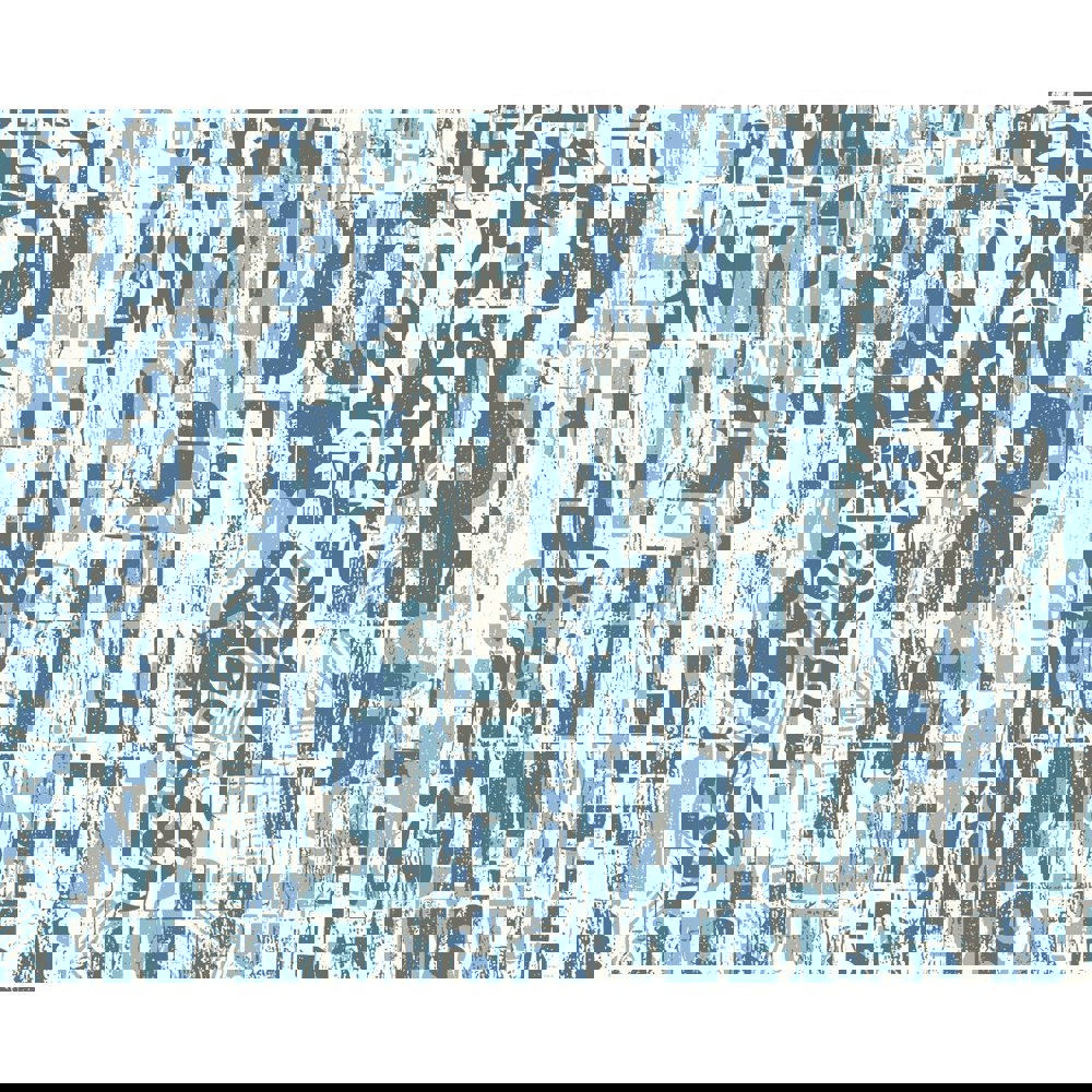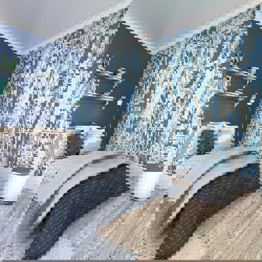 This design features bold, printed letters of different sizes, overlapping each other and sitting against a coloured ground. Grungy and worn this mural has a raw urban feel to it.