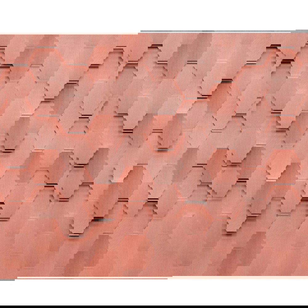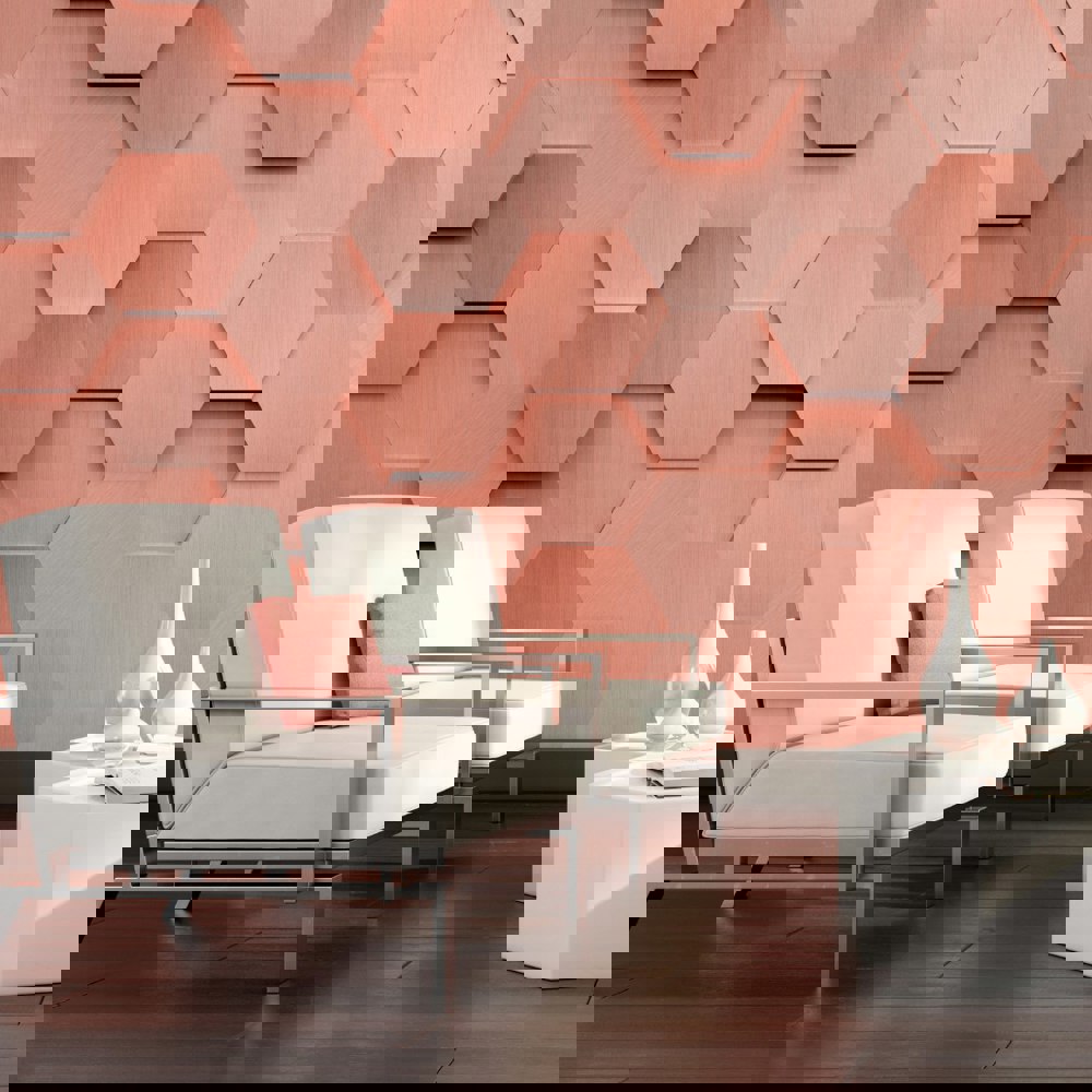 This metallic honeycomb design is urban yet contemporary, shadowing and shading create a life-like 3D effect, truly bringing this mural to life, and the repetition of little hexagons introduce a sense of flow.