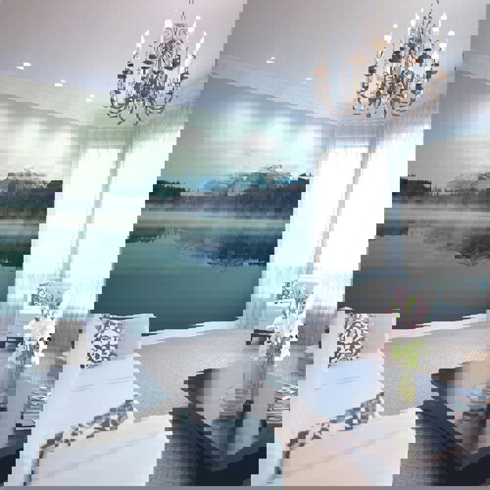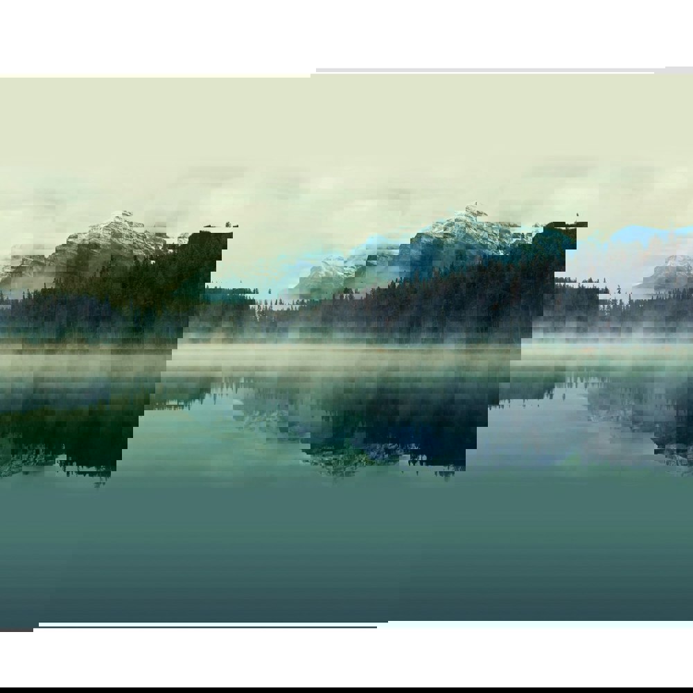A scene of serenity, snow-capped mountains and thick evergreen forests are mirrored through a reflection on a still and clear lake. A layer of light mist sits just above the water, introducing drama and atmosphere.