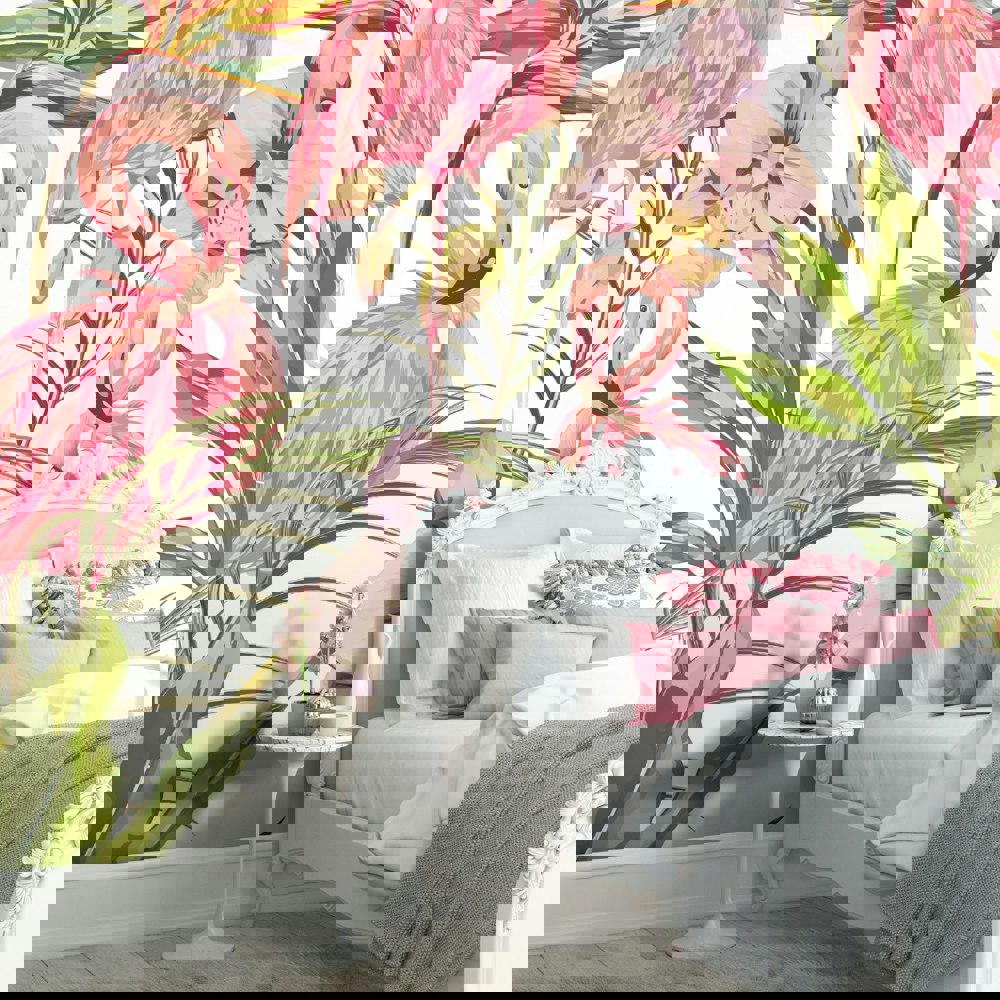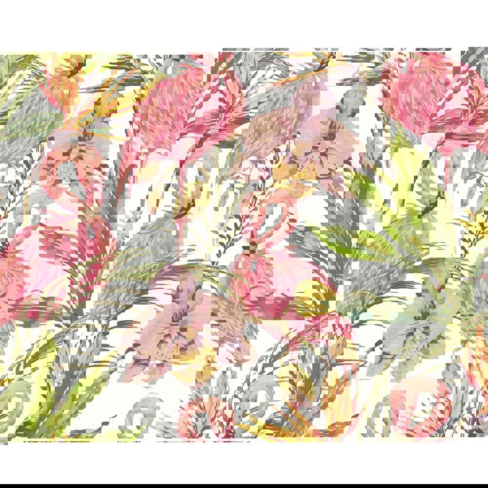 Large scale and abundant, wildlife in all its forms come together in this tropical scene. Painterly palm leaves host fluffily-feathered flamingos and soft watercolour orchids, whilst bird of paradise flowers reach skyward in the background creating height and textured layering.