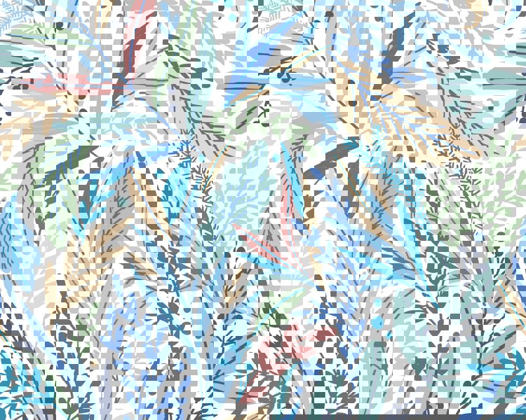An array of illustrative leaves, stems and graphic foliage overlap and intertwine in this simple yet contemporary mural. The multi-directional nature of the design creates liveliness with deviating dots and little petals adding spirit and movement.