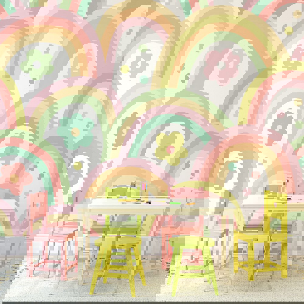 Bring all the positive vibes to your space with this joyous design, featuring a perfectly imperfect wobbly rainbow formation, with simple polka dots and flowers dancing in surrounding spaces. Retro and playful this design is bound to lift spirits and energise.