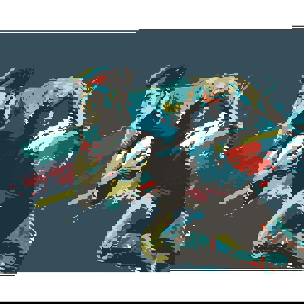 This dynamic design features a rugby player running with the ball, with organic strokes of colour indicating just how fast they're running and creating a sense of life and movement.