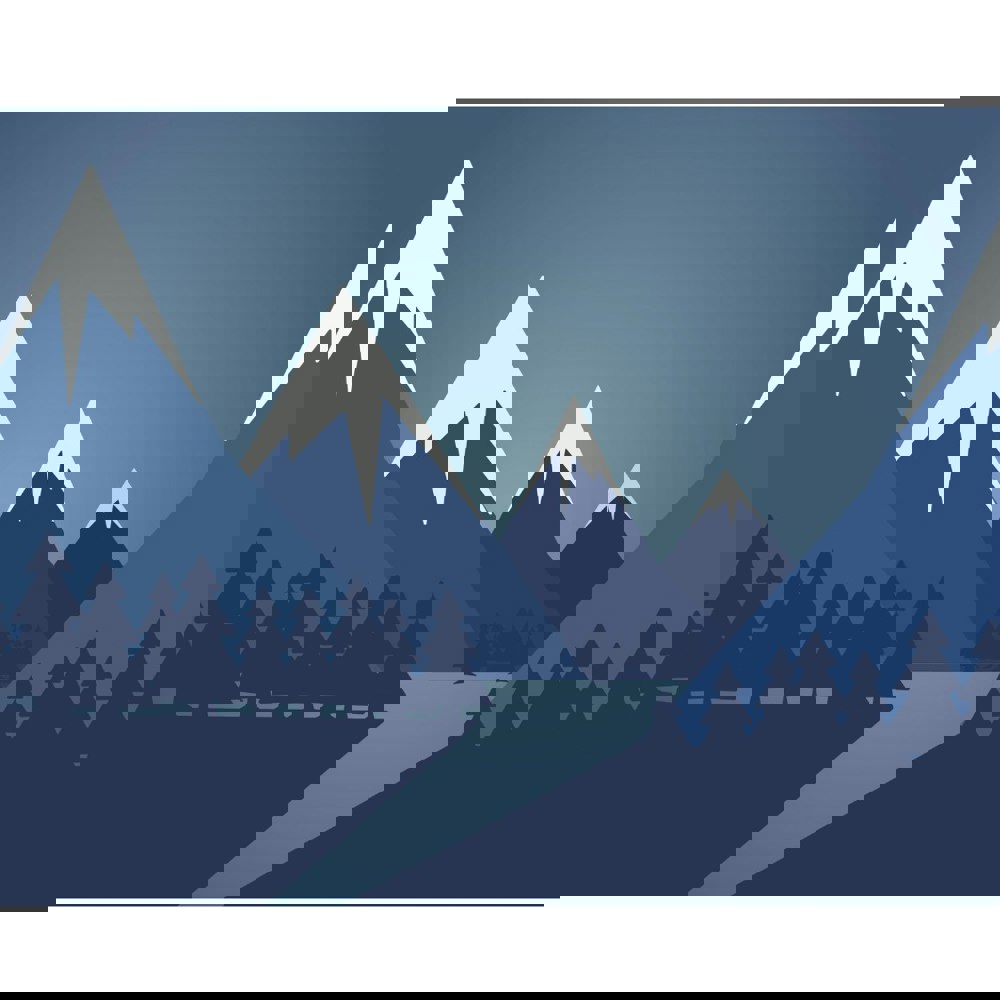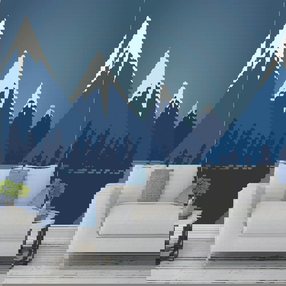 Bring the outdoors in with this snow-topped mountain scene, featuring dark navy blue pine trees and a clear night’s sky, creating a sense of openness and fresh air.