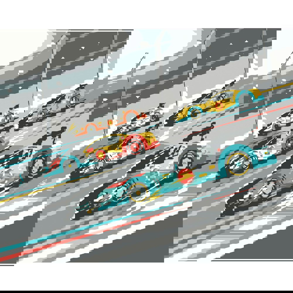 Sportscars of different colours race around a track under a night sky dotted with stars. A sense of dynamicity and movement is created through speedy zigzag symbols around the cars, showing just how fast they’re going.