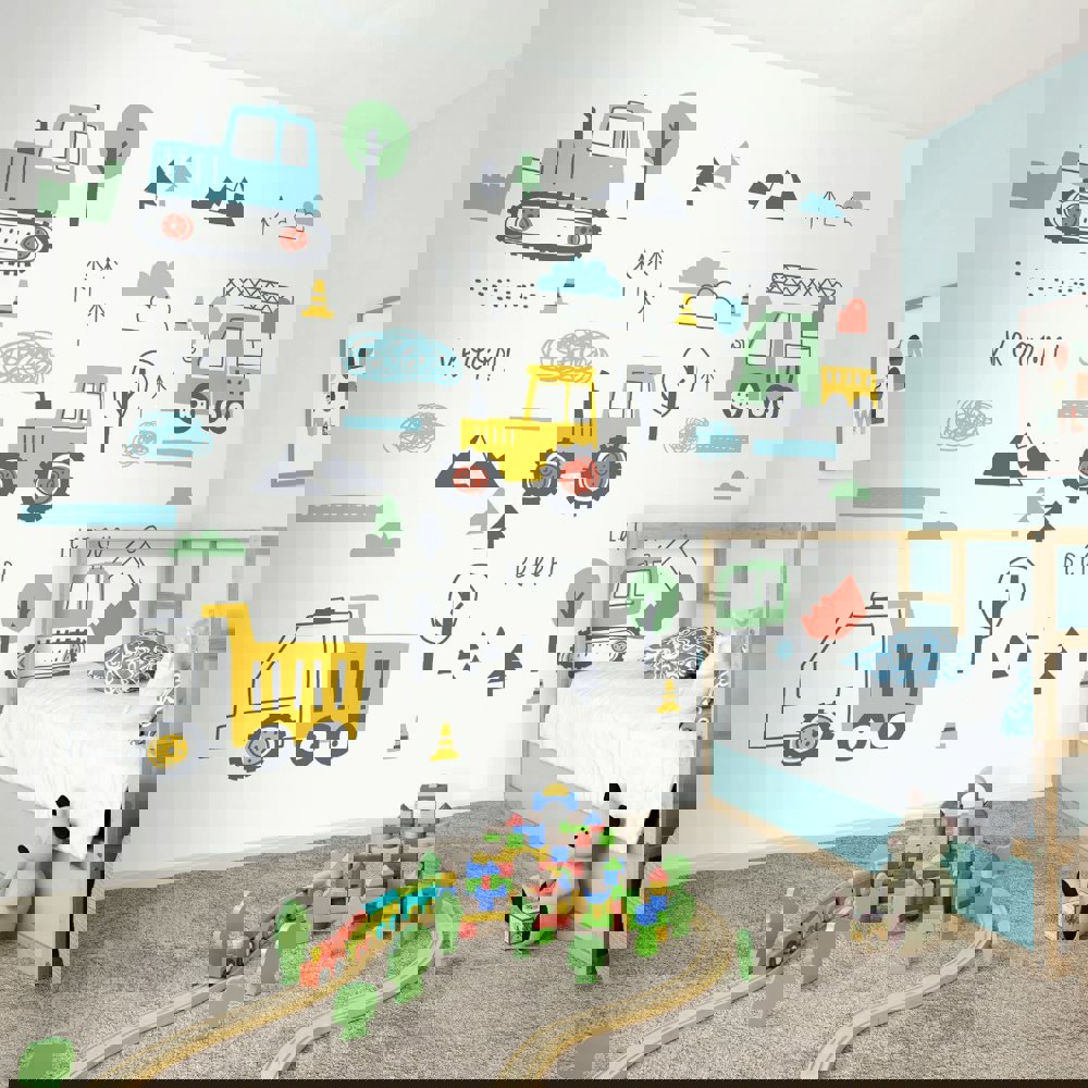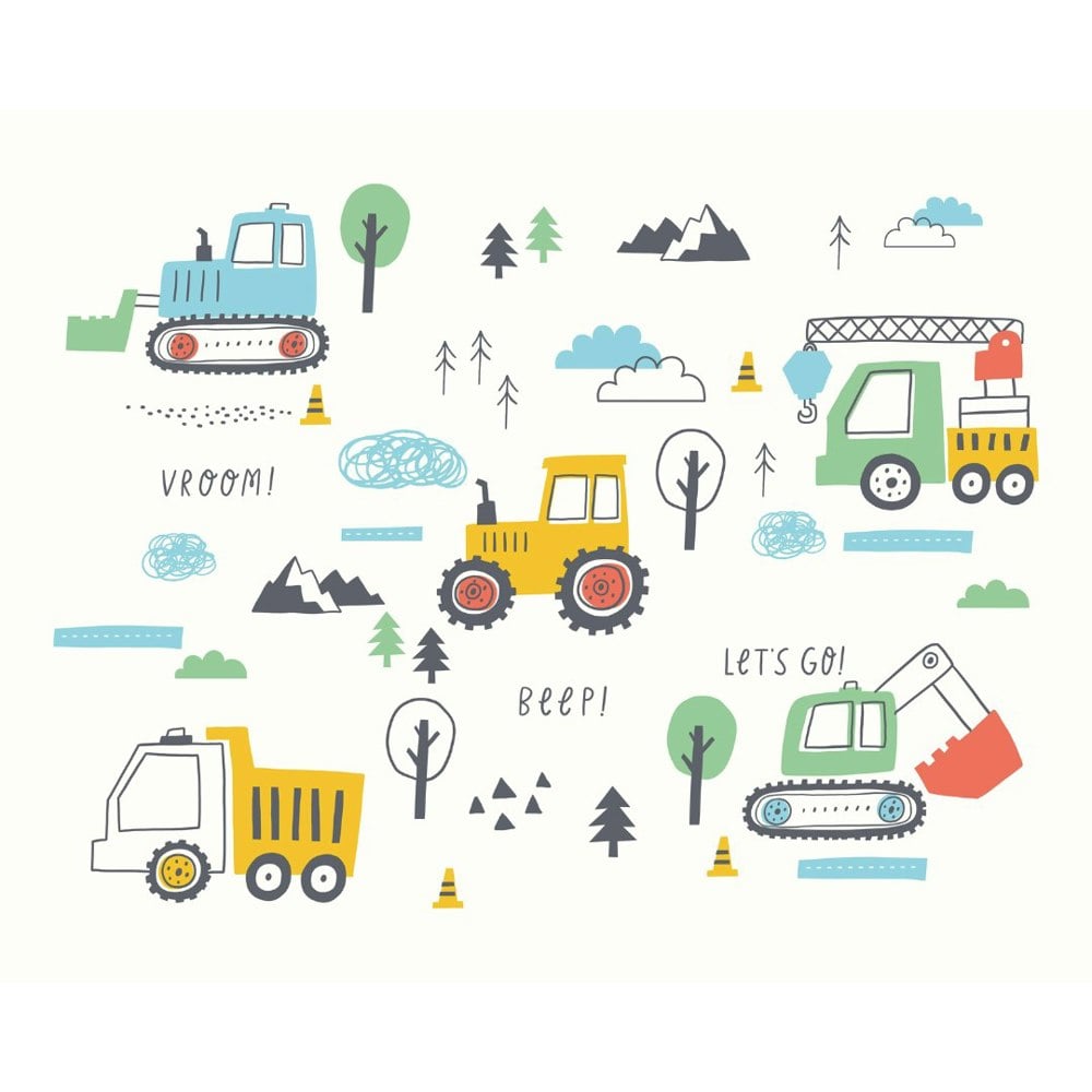 Cartoon trucks, tractors and diggers feature amongst doodled trees, clouds and little work cones in this dynamic design, the perfect mural for any little builders. Grab your hardhat and let’s go!