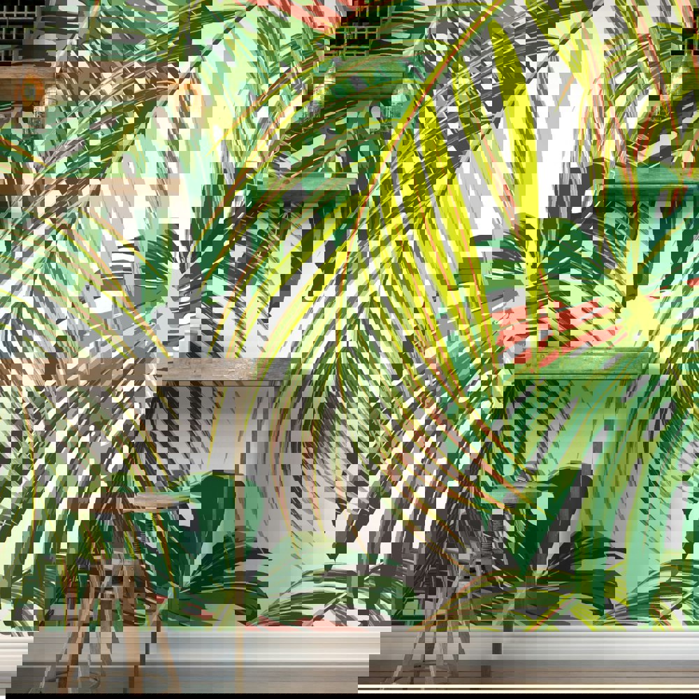 Large-scale tropical foliage drape into the scene from all directions in this organic design, artistic brush strokes create depth and add layers of tonal colour and dimension.