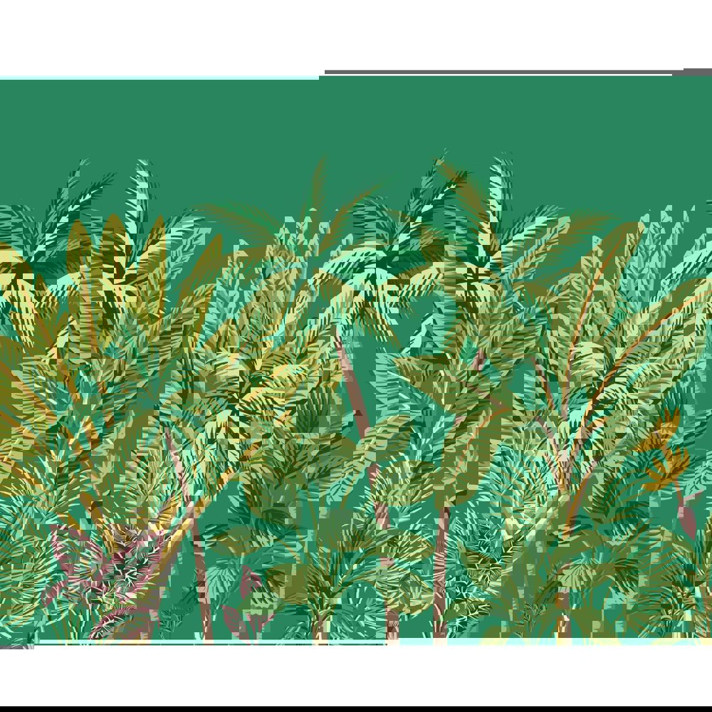 This stylish, tropical wall mural features an abundance of swaying palm trees, exotic foliage and banana leaves. A vibrant, bold design that is full of personality.