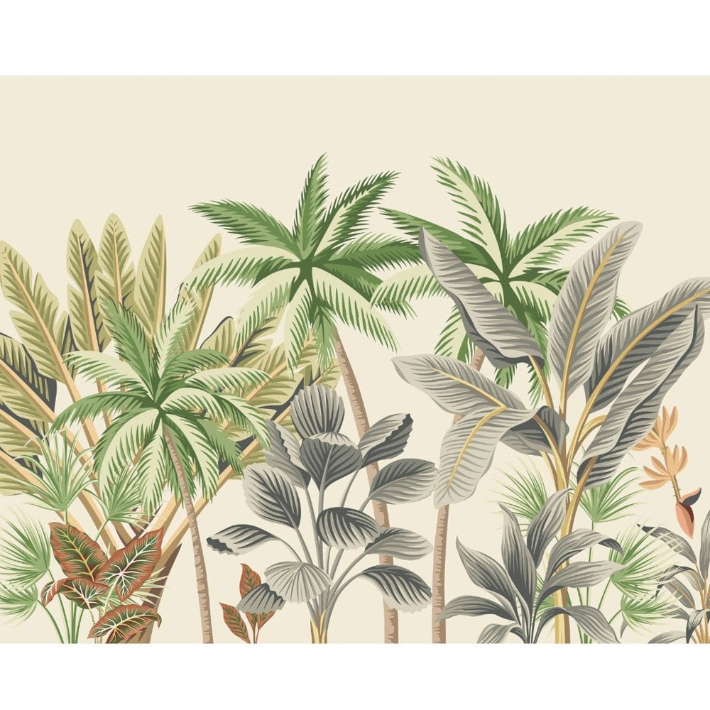 This stylish, tropical wall mural features an abundance of swaying palm trees, exotic foliage and banana leaves. A vibrant, bold design that is full of personality.