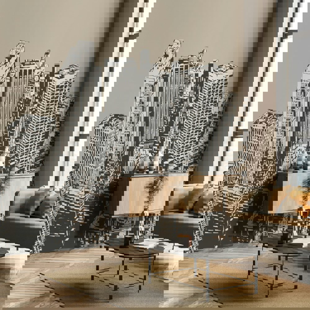 Get the best view in the house with this encapsulating mural of a city skyline, experience a sense of urban serenity as you tower over the busy city below, removed from the hustle and bustle whilst still being among contemporary life.