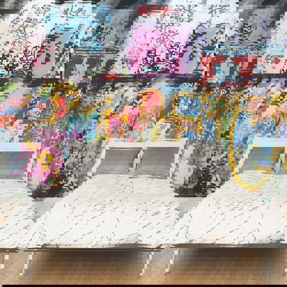 Expression knows no limits in this display of urban creativity, with graffiti influences and vibrant colours making this mural unapologetically bold, introduce some city flair into your space.