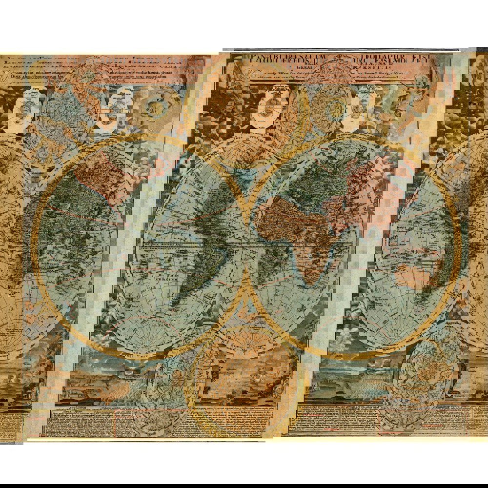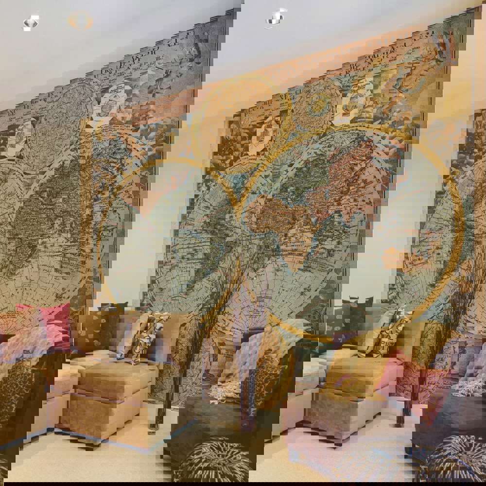 Intricately detailed continents, adorned with charming cherubs combine to create this vintage-esque mural.