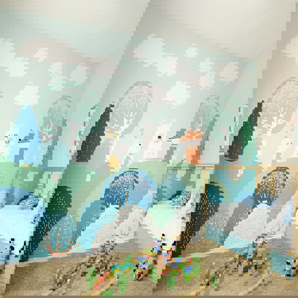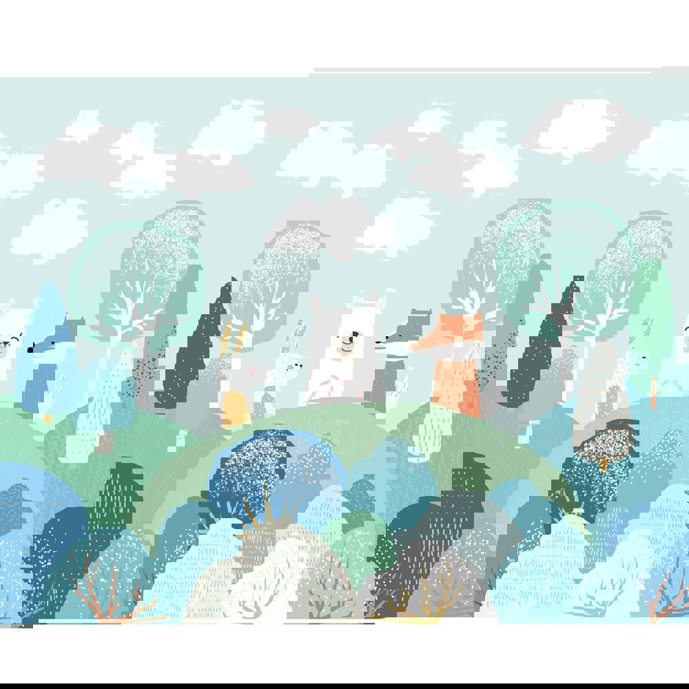 Add whimsical charm to your children’s bedroom with this wall mural. A rabbit, bear and fox sit in a woodland forest, surrounded by patterned trees and shrubs. Chatting away, the animals make plans for their next adventure together.