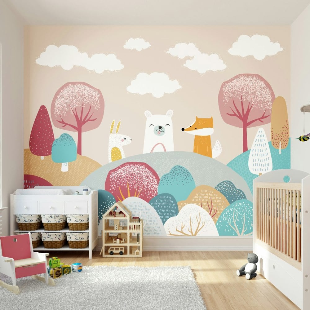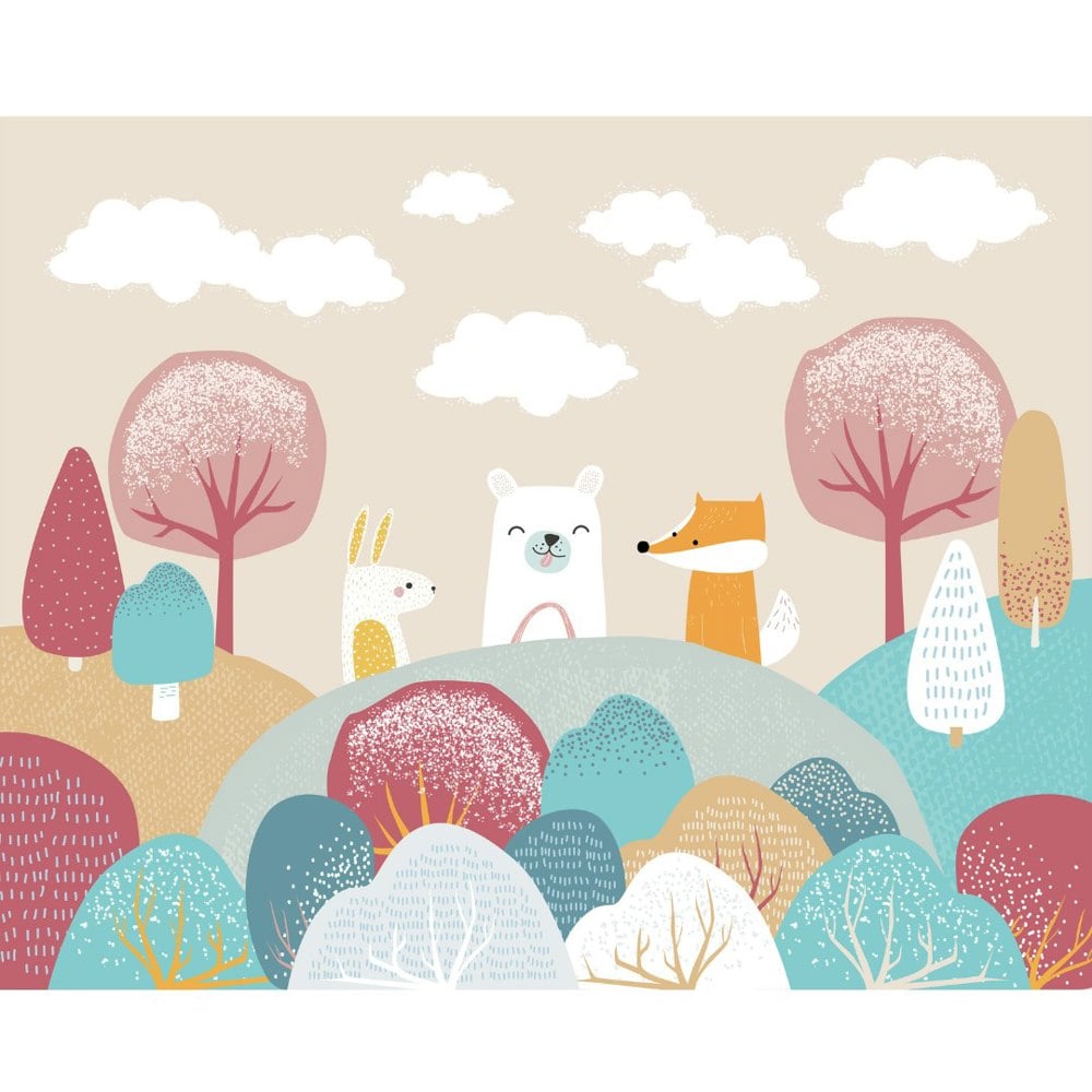 Add whimsical charm to your children’s bedroom with this wall mural. A rabbit, bear and fox sit in a woodland forest, surrounded by patterned trees and shrubs. Chatting away, the animals make plans for their next adventure together.
