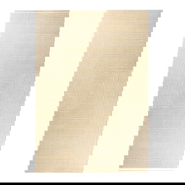 This Pyramid rug is made up of a geometric pattern with changing directions all centred around a pyramid shape in the centre in a beige and sand colourway with highlights of yellow