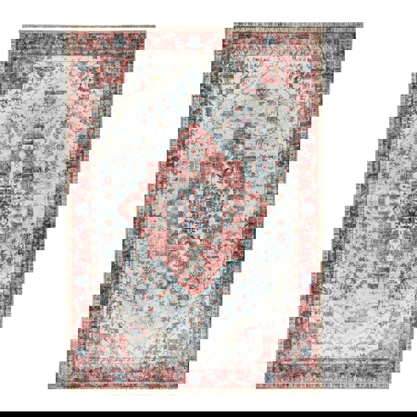 The design featuring a large medallion with an elaborate border with a distressed look