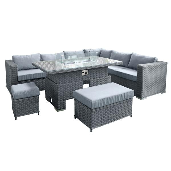 Designed for relaxed outdoor entertaining, the Oseasons Buxton Rattan 9 Seat Rising Firepit Corner Set brings together generous seating and a versatile centrepiece for your garden or patio. Finished in ocean grey rattan with grey cushions, it creates a cohesive look for terraces and outdoor gathering spaces.