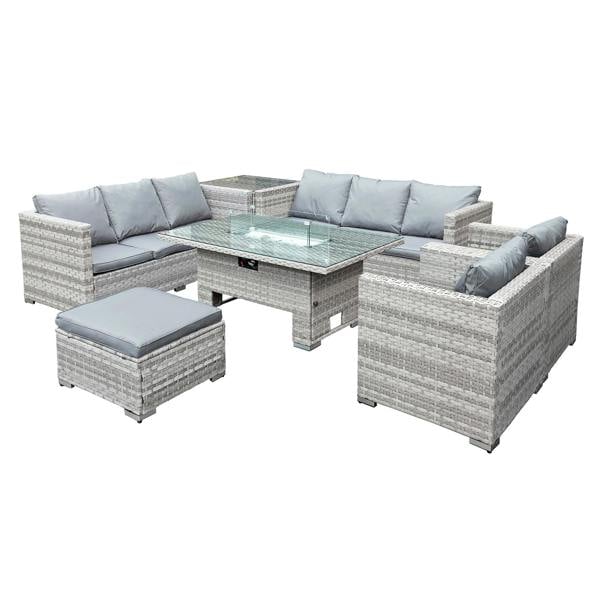 Designed for relaxed entertaining, the Oseasons Malta Rattan 9 Seat Rising Firepit U-Shape Set brings together deep seating and a versatile rising table for an outdoor space that moves easily from daytime lounging to evening gatherings. Finished in dove grey, the set includes coordinating sofas, arm chairs, a tall side table and an oversized footstool for flexible, sociable seating.
