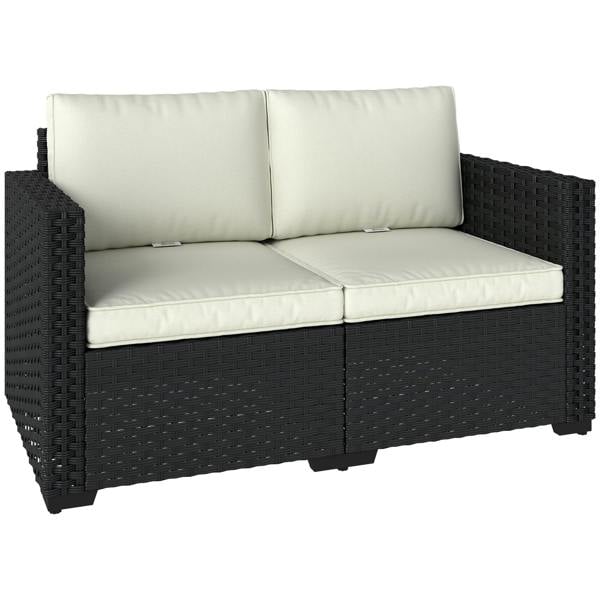 Designed for relaxed outdoor lounging, the Outsunny 2 Seater Rattan Garden Sofa brings a considered, contemporary look to patios, balconies and garden spaces. Finished in black, it pairs a steel frame with double and three strand rattan wrapping for a smart, easy-care addition to your outdoor furniture.