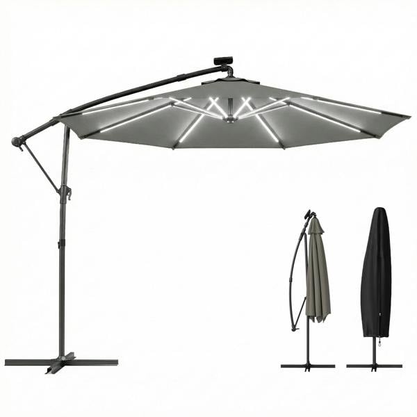This Outsunny cantilever garden parasol with base included combines style and practicality perfectly! The solar-powered LED lights emit a white glow, extending your garden time. The included protective cover keeps your parasol looking fresh all year round. Change the coverage as the sun's movement with the tilting and 360° swivel canopy to keep cool from every angle. Relax outdoors in style with this must-have garden companion!
