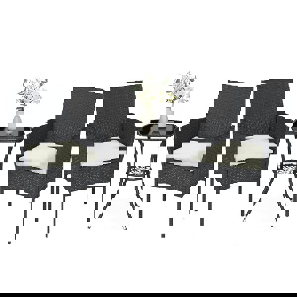Powder-coated steel frames support the chairs and table, with PE wicker wrapping to help resist rust, UV and weather. The table is topped with tempered glass for a clean, practical surface, while a lower shelf adds useful space for drinks, snacks or reading material. Zipped cushion covers make removal and cleaning straightforward, and protective foot pads help reduce floor scratches.
