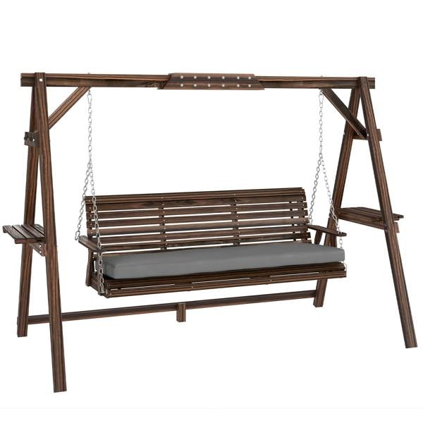 Relax and unwind outdoors with the Outsunny wooden swing chair. Ergonomically designed for up to 3 people, it features a gently angled backrest, wide seat and supportive armrests for cosy comfort, while the thick, padded cushion adds extra luxury. Great for outdoor lounging, it includes handy built-in side shelves for drinks or essentials and the removable cushion cover makes cleaning a breeze.