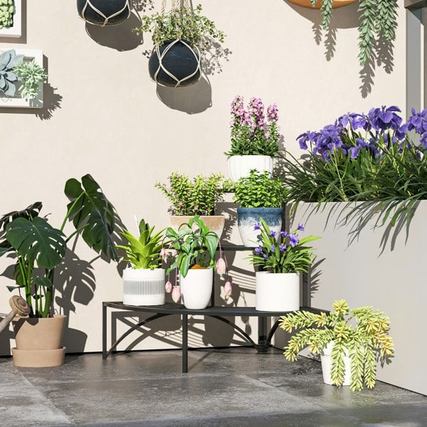 Transform any corner into a vibrant display with the Outsunny Flower Stand! This three-tiered, fan-shaped metal plant stand fits snugly in corners, maximising space while ensuring your plants bask in sunlight. Its hollow, breathable design and rust-proof coating make it great for both indoor and outdoor use, supporting up to 30kg. Suitable for showcasing plants, books, or décor on your balcony or garden.
