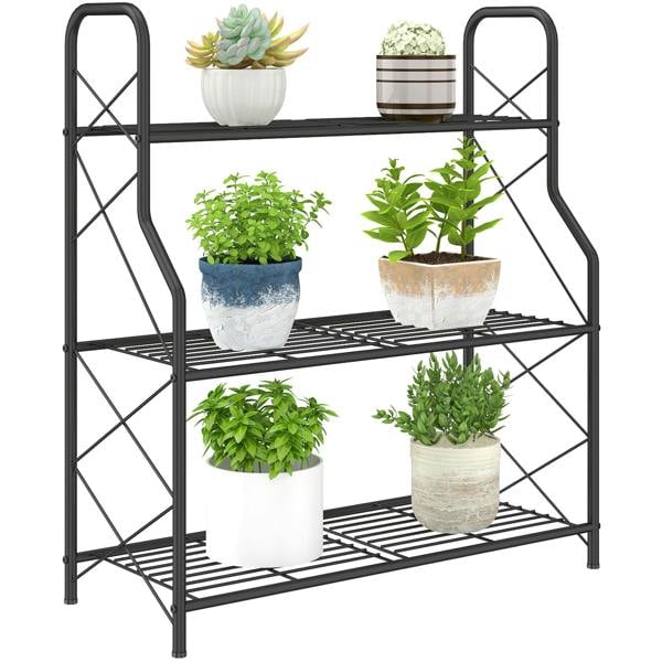 A solid metal frame is reinforced with X-shaped side supports to help keep pots secure and reduce the risk of tipping. Powder-coated shelves are made to resist rust, and adjustable feet help you position the stand steadily. Built-in handles and a lightweight design make it simple to move between rooms, balconies or patios, while the clean black finish suits a wide range of settings. It also works well as a compact display shelf for books or décor when you want a practical storage solution that still looks considered.