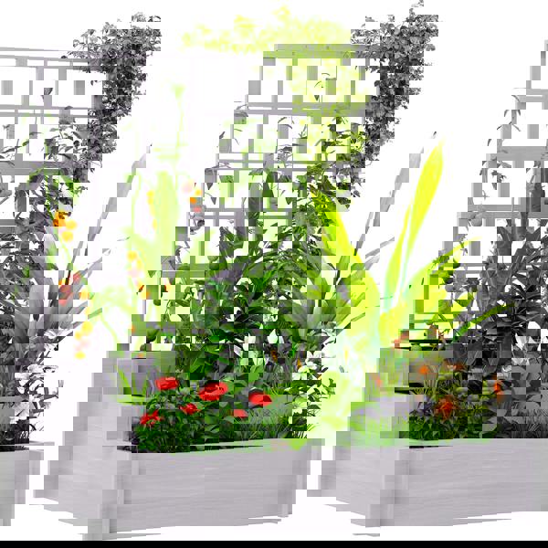 Made from fir wood and finished with a protective paint coating, the raised garden bed is built around a strong wooden structure. An inner fabric bag helps hold soil in place while supporting roots and soil within the planter boxes. With a trellis at the back and three planters below, it offers a simple way to grow a mix of plants, including vegetables and other varieties, while keeping everything neatly contained.